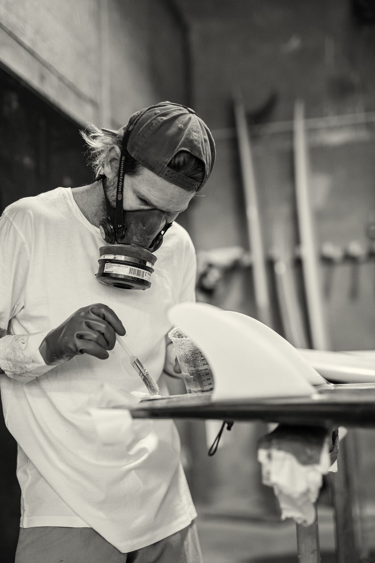 First I’ll stretch, then stack a few boards in the van, get a long black and do the morning surf check. Often I open up my workshop while the